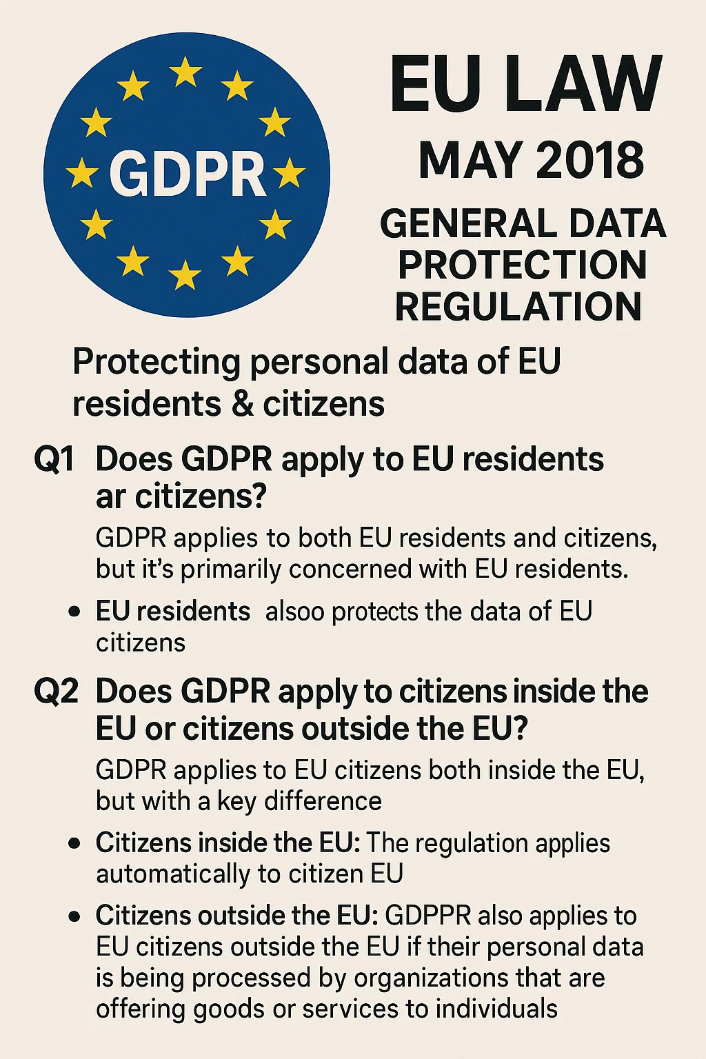 Purpose: Protect the personal data of EU residents and citizens, both within and — under certain conditions — outside EU borders.