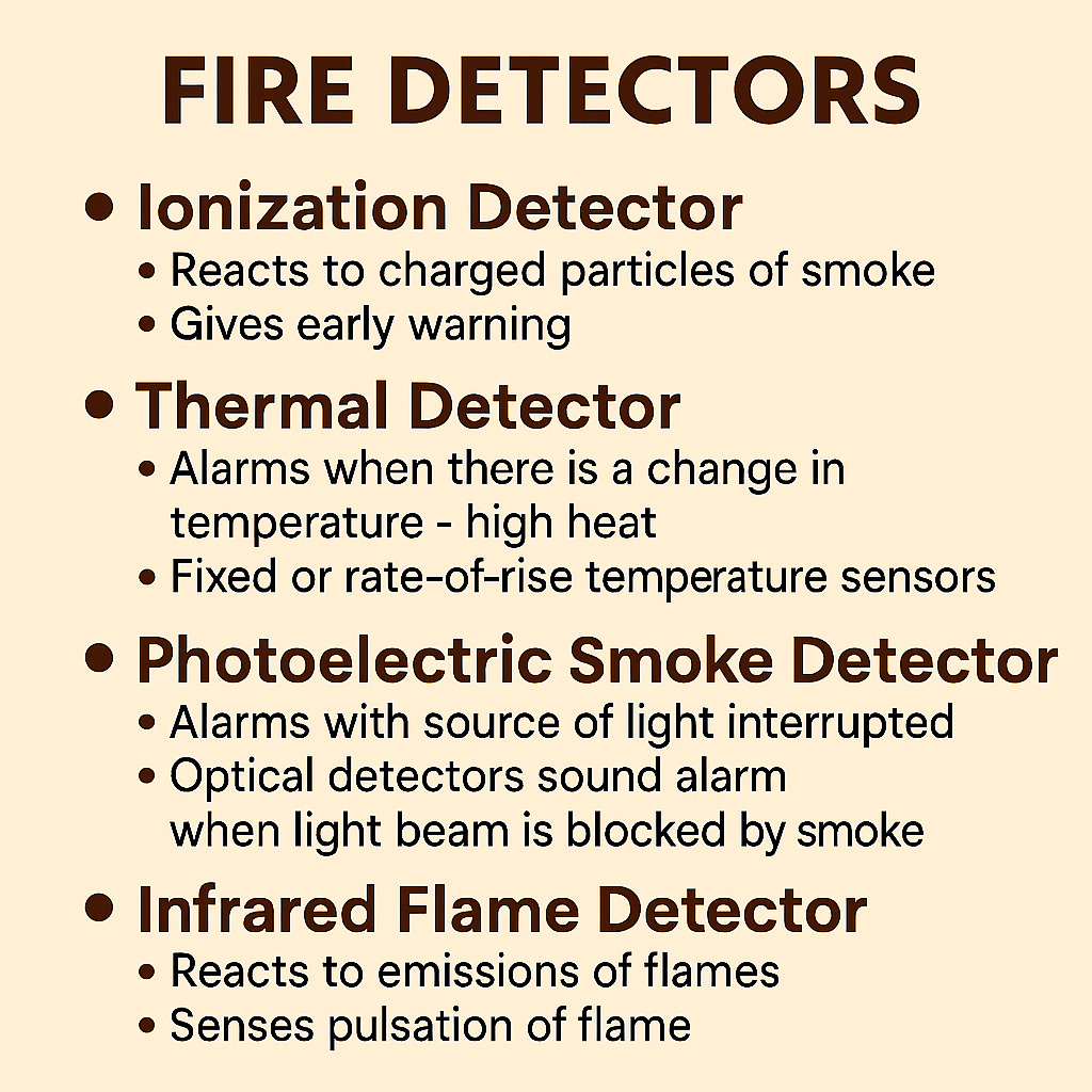 Detectors: Ionization (incipient/flaming), Photoelectric (smoldering), IR flame, Thermal (fixed / rate-of-rise)